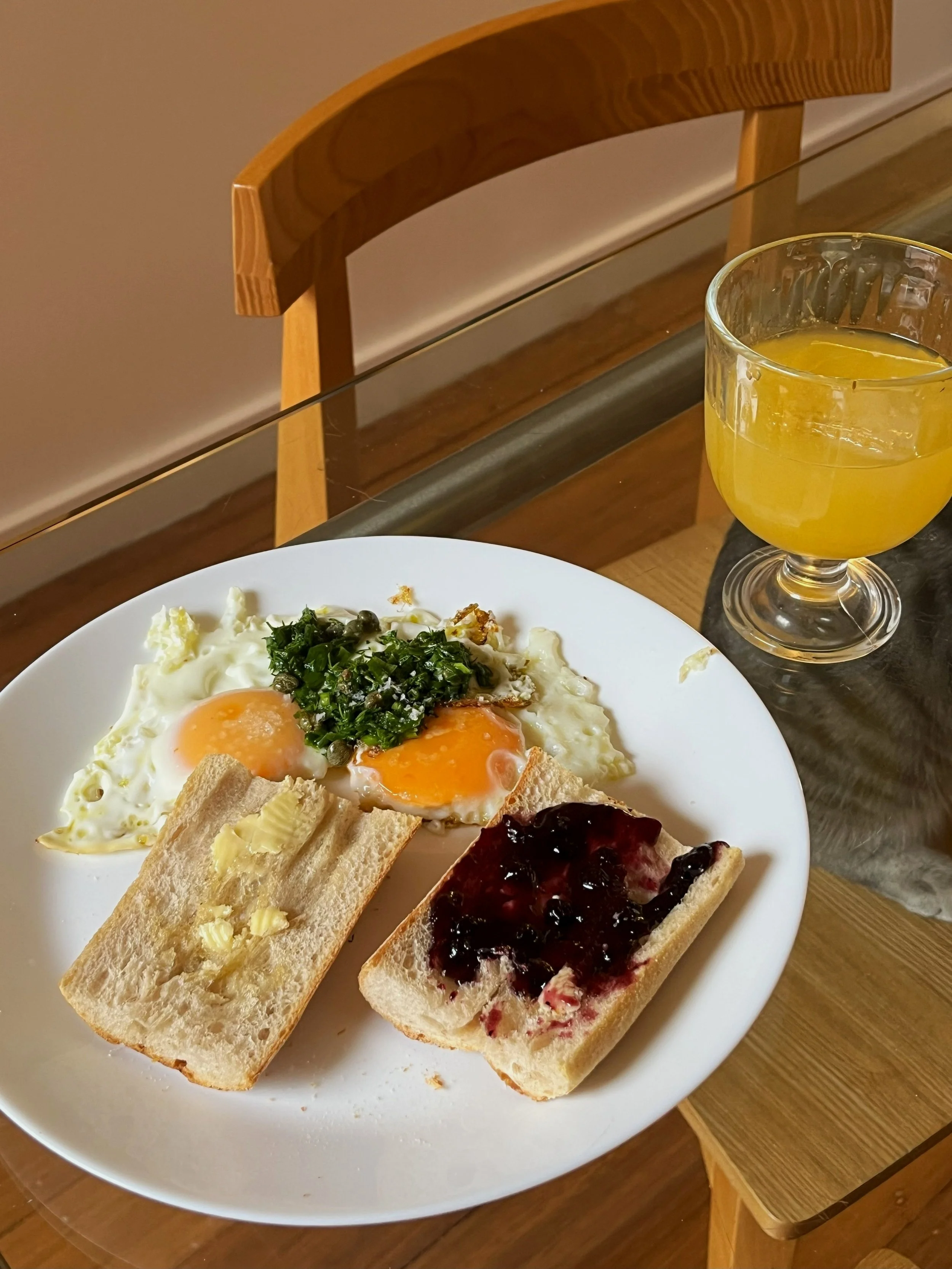 Serve the bread, eggs and herby sauce on a plate and enjoy.
