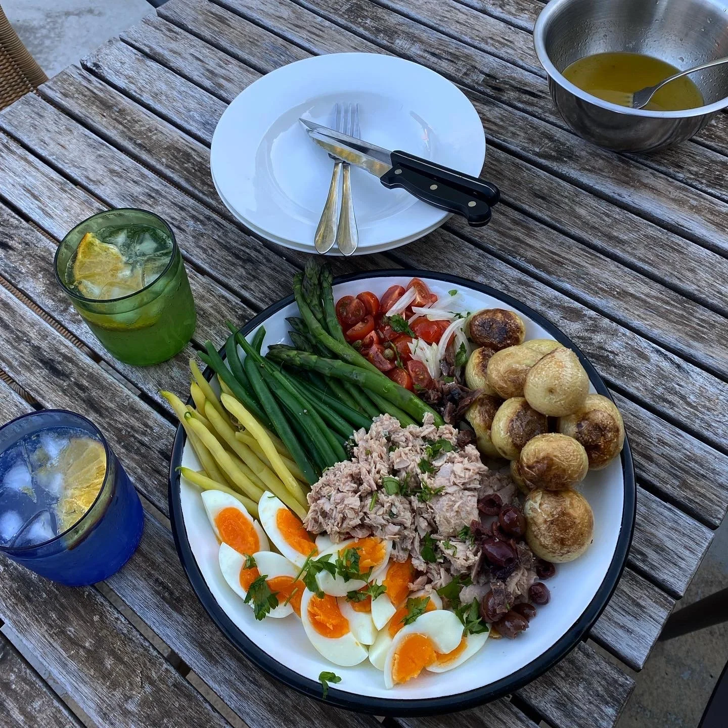 Boil and chop tomatoes, eggs, beans potatoes and drizzle with an easy vinaigrette, voila!